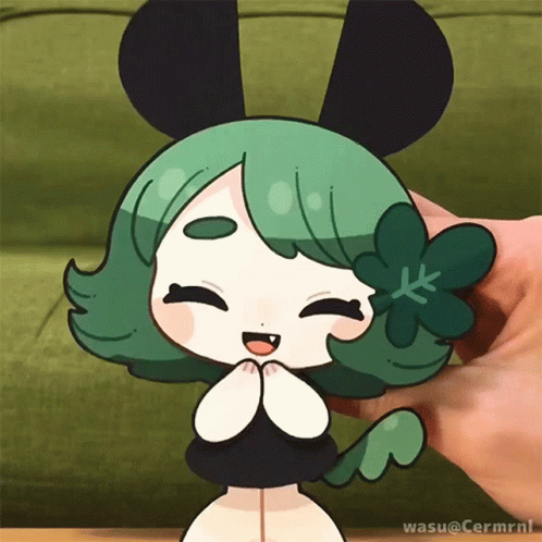 Wasu, the green-haired character, happily claps with a big smile, held by a hand.