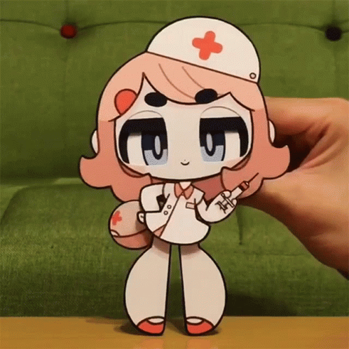 A cute paper doll nurse by Wasu winks and holds an injection, featuring a red cross on her cap.