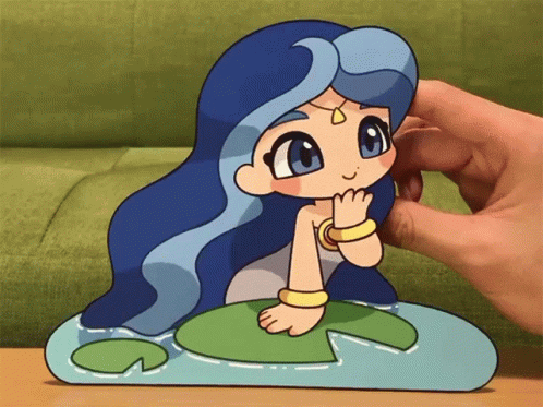 A charming cartoon girl with blue hair, named Wasu, depicted as a cutout art piece, held by a hand.