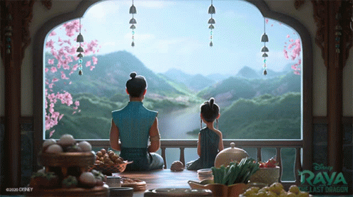 Young Raya and Chief Benja from Disney's Raya and the Last Dragon relax on a balcony, enjoying a beautiful view.