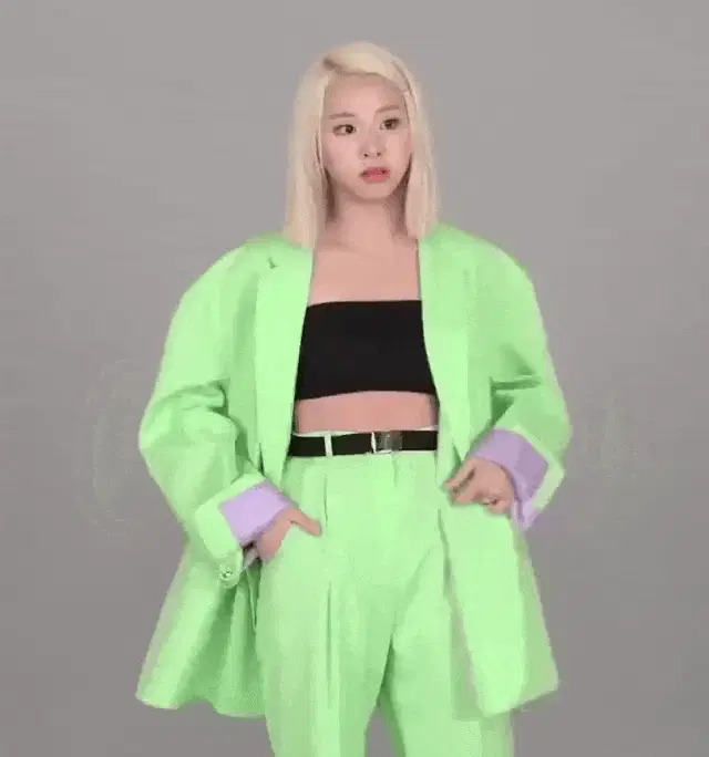 Chaeyoung from Purple Kiss making a 'watching you' gesture while wearing a cozy white sweater.