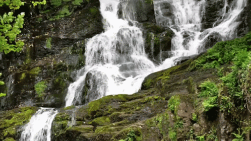 A beautiful waterfall cascades over moss-covered rocks, surrounded by vibrant green foliage in a serene natural setting.