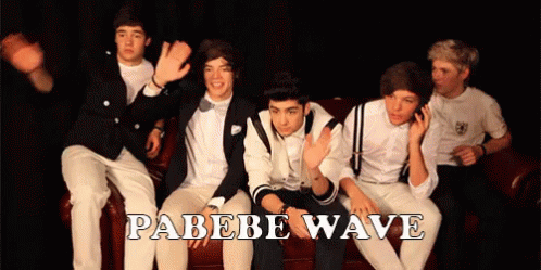 One Direction members perform the iconic Pabebe Wave while seated on a couch.