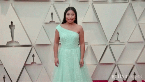 Yalitza Aparicio, wearing a stunning mint green gown, waves to the cameras on the Oscars red carpet.