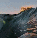 A close-up view of an ocean wave with the sun's golden light reflecting on the water.