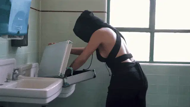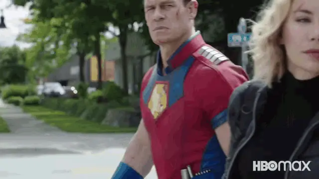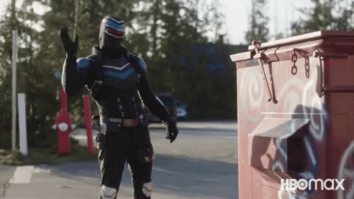 Vigilante from Peacemaker waves hello next to a red dumpster, showcasing the DC Comics character.