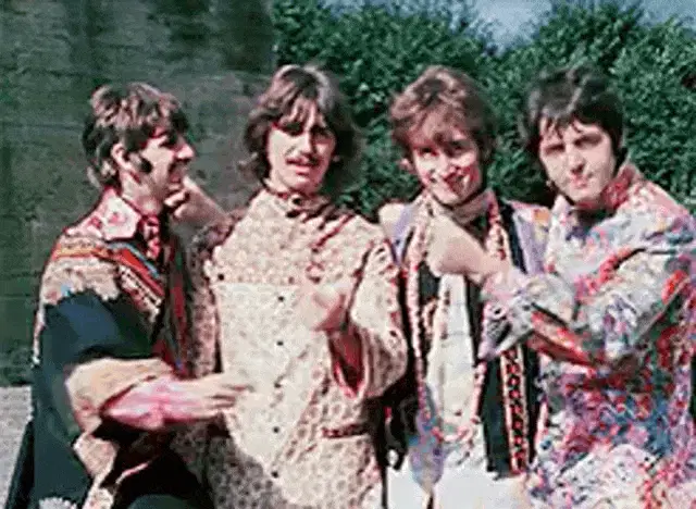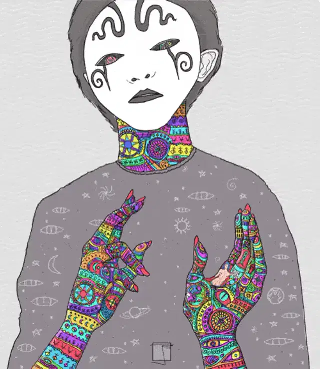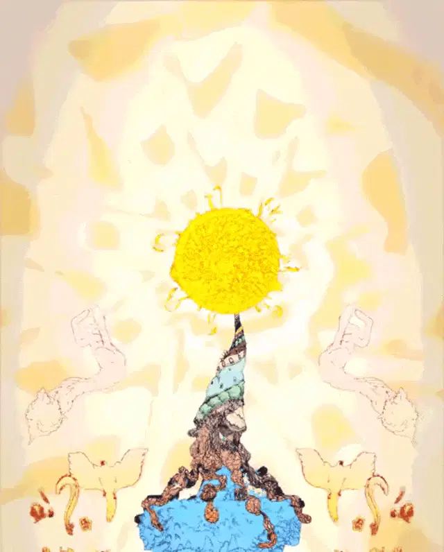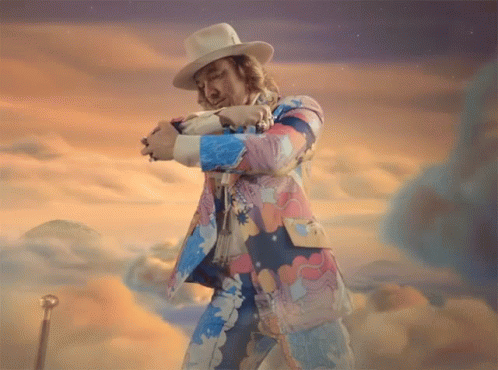 Diplo in a colorful suit and cowboy hat performing a waving hands spirit fingers dance in the clouds.