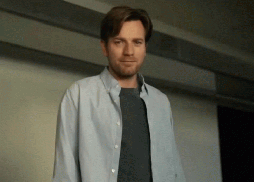 Ewan McGregor smiling and waving hello, wearing a light blue shirt.