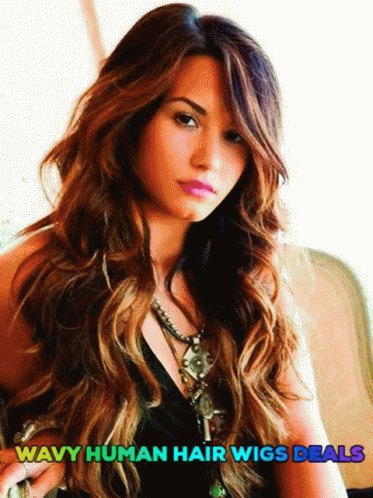 A woman with long, wavy hair showcases deals on wavy human hair wigs, also related to hair oil products.
