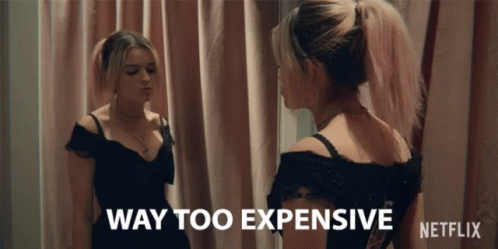 Emma Mackey as Maeve Wiley reacts to a dress being 'WAY TOO EXPENSIVE' in a Netflix scene.