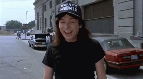 Mike Myers as Wayne Campbell from Wayne's World smiles and gives two thumbs up, wearing his iconic cap.