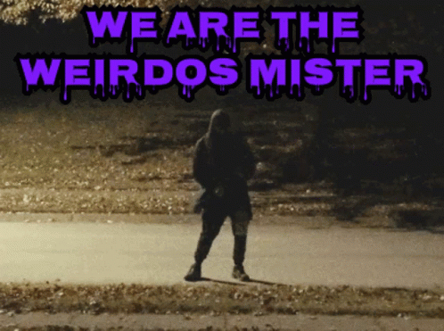 Person in dark clothing stands alone at night outdoors, with 'WE ARE THE WEIRDOS MISTER' text overlay.