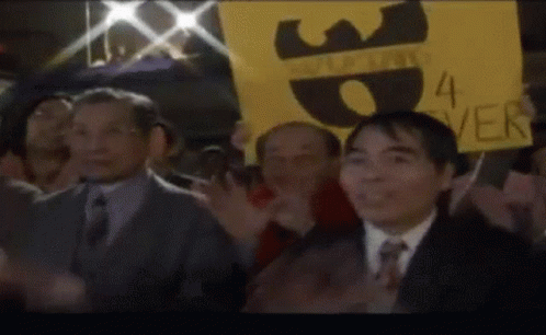 We Tang group applauding enthusiastically while holding signs, including one that says '4 ever'.