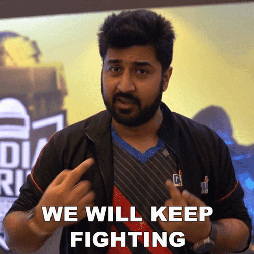 Rushi (Rushindra Sinha) of Global Esports passionately declares, 'We will keep fighting,' inspiring his audience.