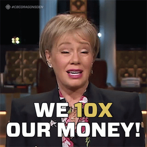 Arlene Dickinson from CBC's Dragons' Den excitedly announces a 10x return on investment.