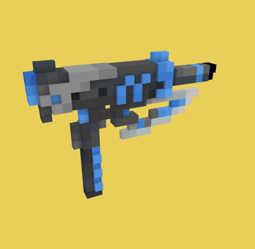 A rotating pixel art gun with blue and grey blocks, showcasing a futuristic cyberpunk design in a voxel style.