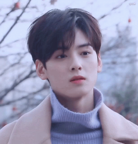 Cha Eunwoo in a light purple turtleneck and beige coat, looking around with a weary expression.