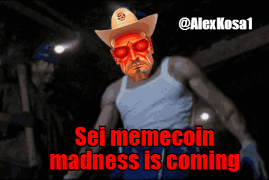 Alex Kosa's Webump Machiyanft meme featuring a cowboy hat and the text 'Sei memecoin madness is coming'.