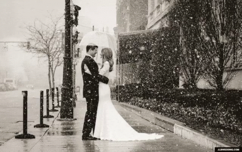 A romantic wedding couple shares an umbrella in the rain, captured in a beautiful black and white moment.