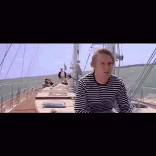A man in a striped shirt on a sailboat, from the movie Wedding Crashers.