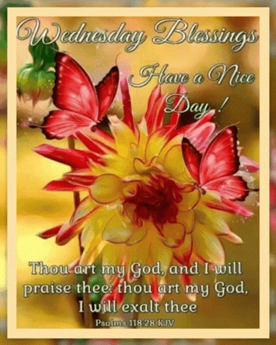 A beautiful image with 'Wednesday Blessings Have a Nice Day!' and a Bible verse, featuring flowers and butterflies.