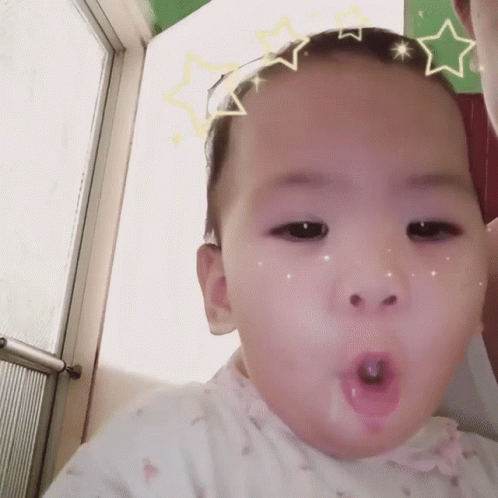 An adorable baby with a star filter on its head makes funny faces, opening its mouth wide and smiling playfully.
