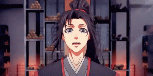 Wei Wuxian from Mo Dao Zu Shi shows a surprised and slightly distressed expression, turning his head.