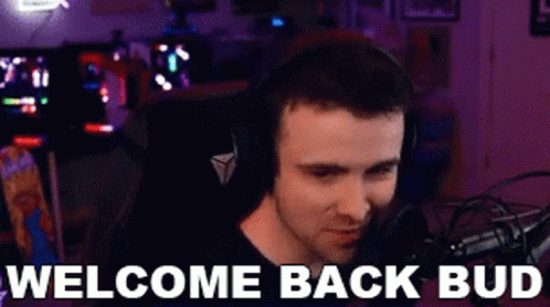 DrLupo, wearing headphones, smiles in front of a microphone with 'WELCOME BACK BUD' text.