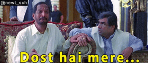 Nana Patekar and Paresh Rawal in a scene from Welcome, saying 'Dost hai mere' (They are my friends).