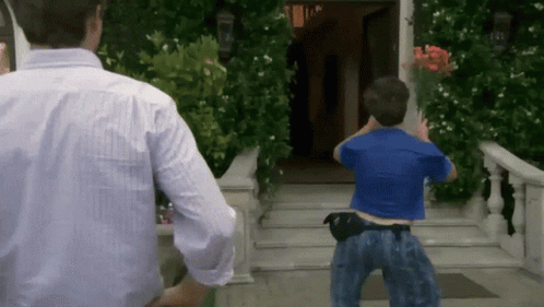 Adam Demamp from Workaholics holds a bouquet of flowers, welcoming someone to his house.