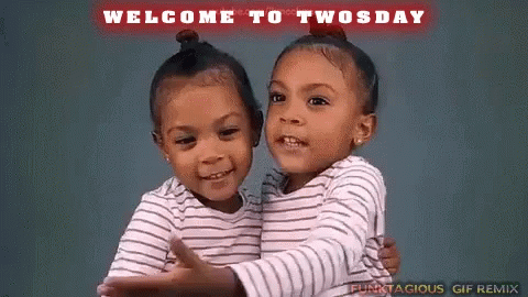 Adorable twin girls hug each other, celebrating 'Twosday' with a fun, funky vibe.