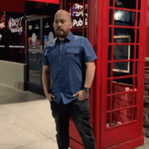 Man reacts with 'Well Damn Oh No' while standing by a red British-style telephone booth outside a pub.