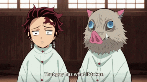 Tanjiro and Inosuke from Demon Slayer, with Inosuke stating, 'That guy has what it takes.'