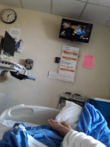 A patient's view of a hospital room, showing a TV, window, and IV stand.