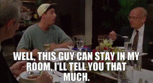 Adam Sandler as Billy Madison delivers the iconic line, 'Well, this guy can stay in my room, I'll tell you that much.'
