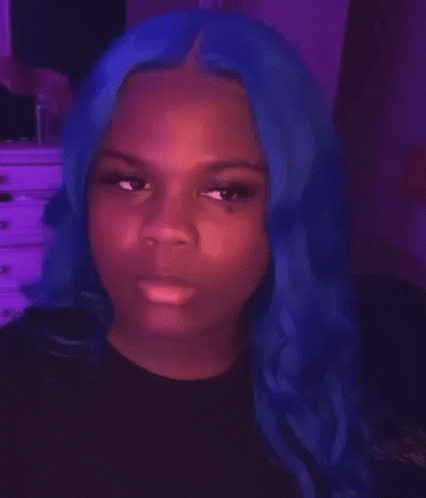 Weluvche Erysctrl with vibrant blue hair looks at the camera with a blank, confused stare in purple lighting.