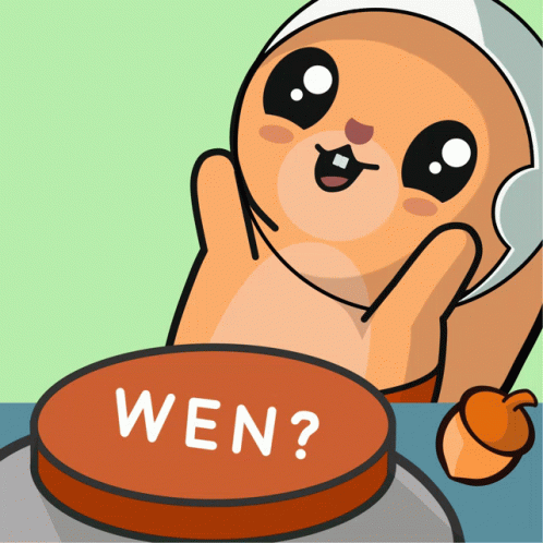 A cute Moonimals squirrel character eagerly presses a button asking 'Wen?' with an acorn nearby.