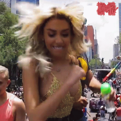 Karime from Acapulco Shore dancing happily in a gold top amidst a lively crowd at a party.