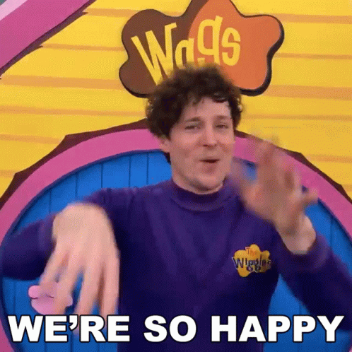 Lachy Wiggle expresses joy, clapping his hands in a purple sweater with a colorful background.