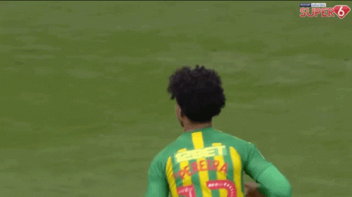 Matheus Pereira celebrates a goal for West Brom, pumping his fist and smiling on the field.