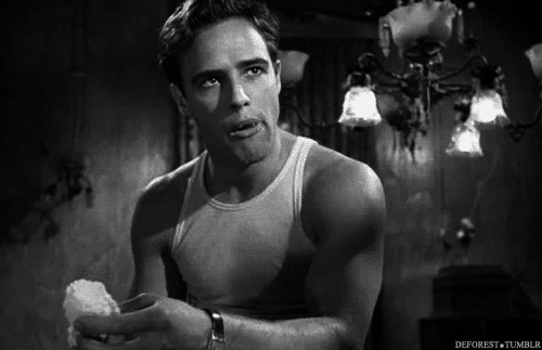 Marlon Brando looks confused while holding food in a scene from A Streetcar Named Desire.