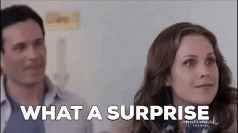 Erin Krakow reacts with a big smile, looking surprised next to a man. The text reads 'WHAT A SURPRISE'.