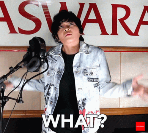 Mita The Virgin shrugging with a confused expression, exclaiming 'What?' in a recording studio.