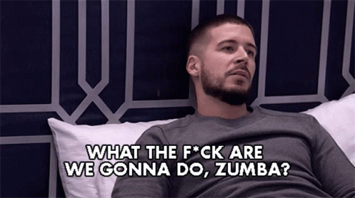 Vinny Guadagnino from Jersey Shore Family Vacation lies on a bed, asking "What the f*ck are we gonna do, Zumba?"