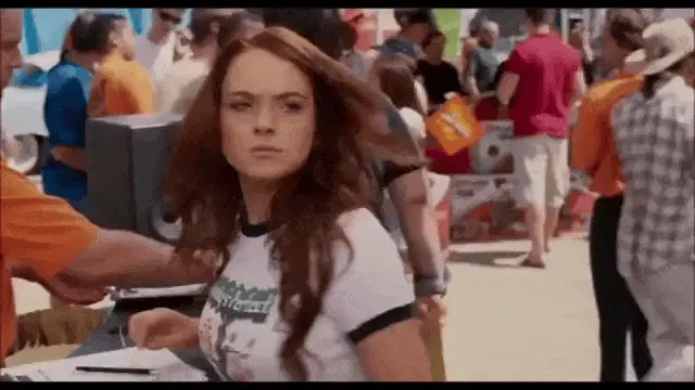 Lindsay Lohan as Cady Heron from Mean Girls asks 'What day is it?' followed by Eduard Löwen's reaction.