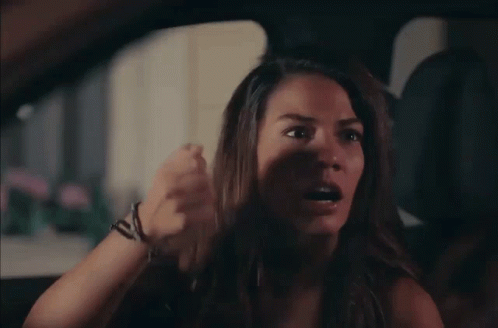 Demet Ozdemir in a car, making a highly expressive and surprised face, from Erkenci Kus.