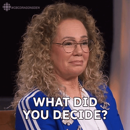 Arlene Dickinson, wearing glasses and a blue jacket, asks 'What did you decide?' on CBC's Dragons' Den.