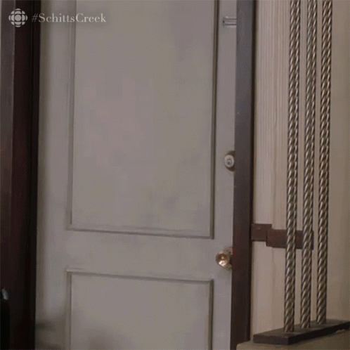 Dan Levy, as David Rose, peeks from behind a door with an upset and glaring expression in Schitt's Creek.