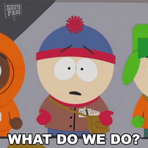 Stan Marsh from South Park, alongside Kenny and Kyle, looks worried and asks 'What do we do?'