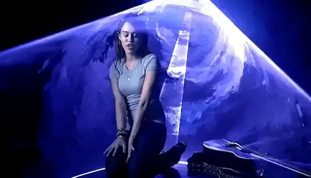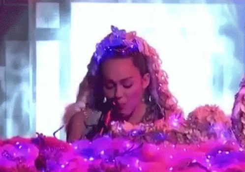 Miley Cyrus passionately sings into a microphone on stage, surrounded by vibrant lights and floral decorations.